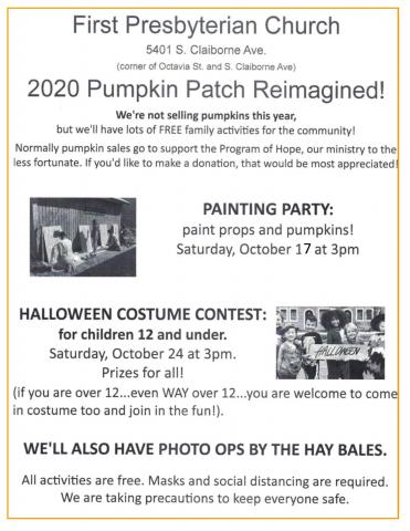 This 2020 year has been full of uncertainty with the covid19. Who could have imgained we would be living in these times. Here at First Presbyterian Church we have decided to reimagine our popular Pumpin Patch this year. Yes, the yard is still there and we are going to still have something fun for the community. (please see attaceh flier). If you cannot open the flier here are our activities