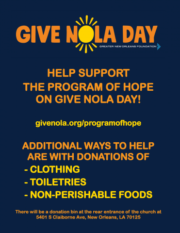 Tuesday, May 7th is Give NOLA Day, the 24 hour and we are decicating all of the funds to the Program of Hope, our homless outreach program.